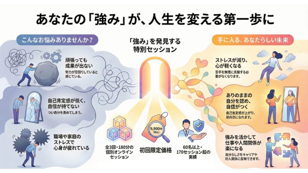 - 継続的に伴走してほしい方向け:強み活用コーチング など