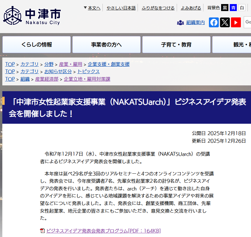 中津市役所ホームページに掲載されました