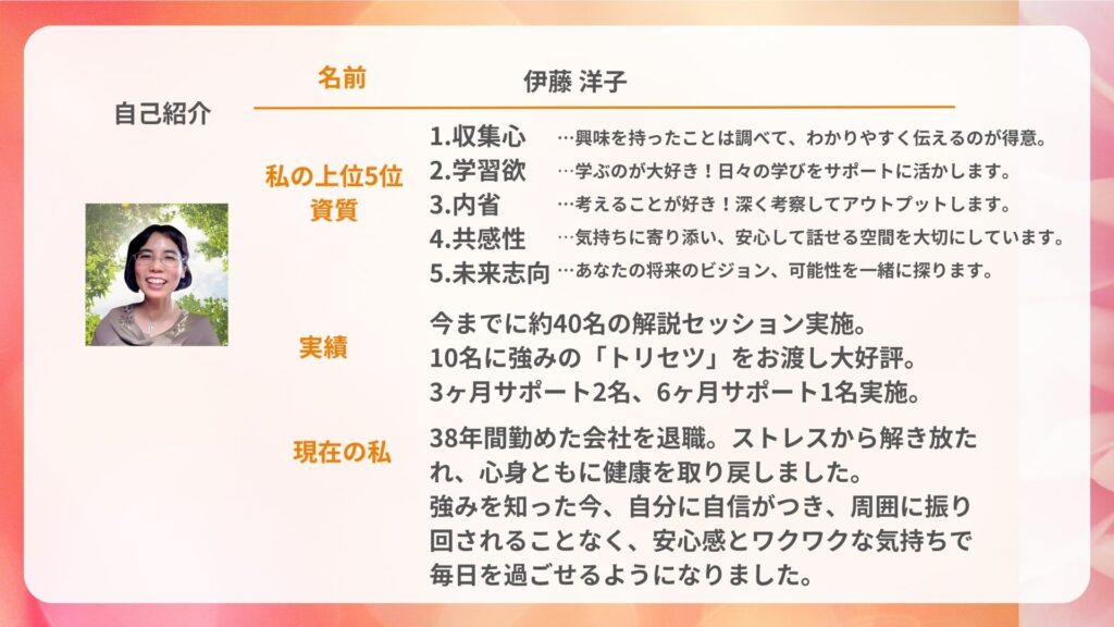 - 私自身も会社員時代のストレスや苦手意識を、ストレングス・ファインダーの活用で克服した実体験者。机上の理論だけでなく、お客様が自分を知ることをサポートし、時には気づきにつながるようご提案をさせていただく場合があります。